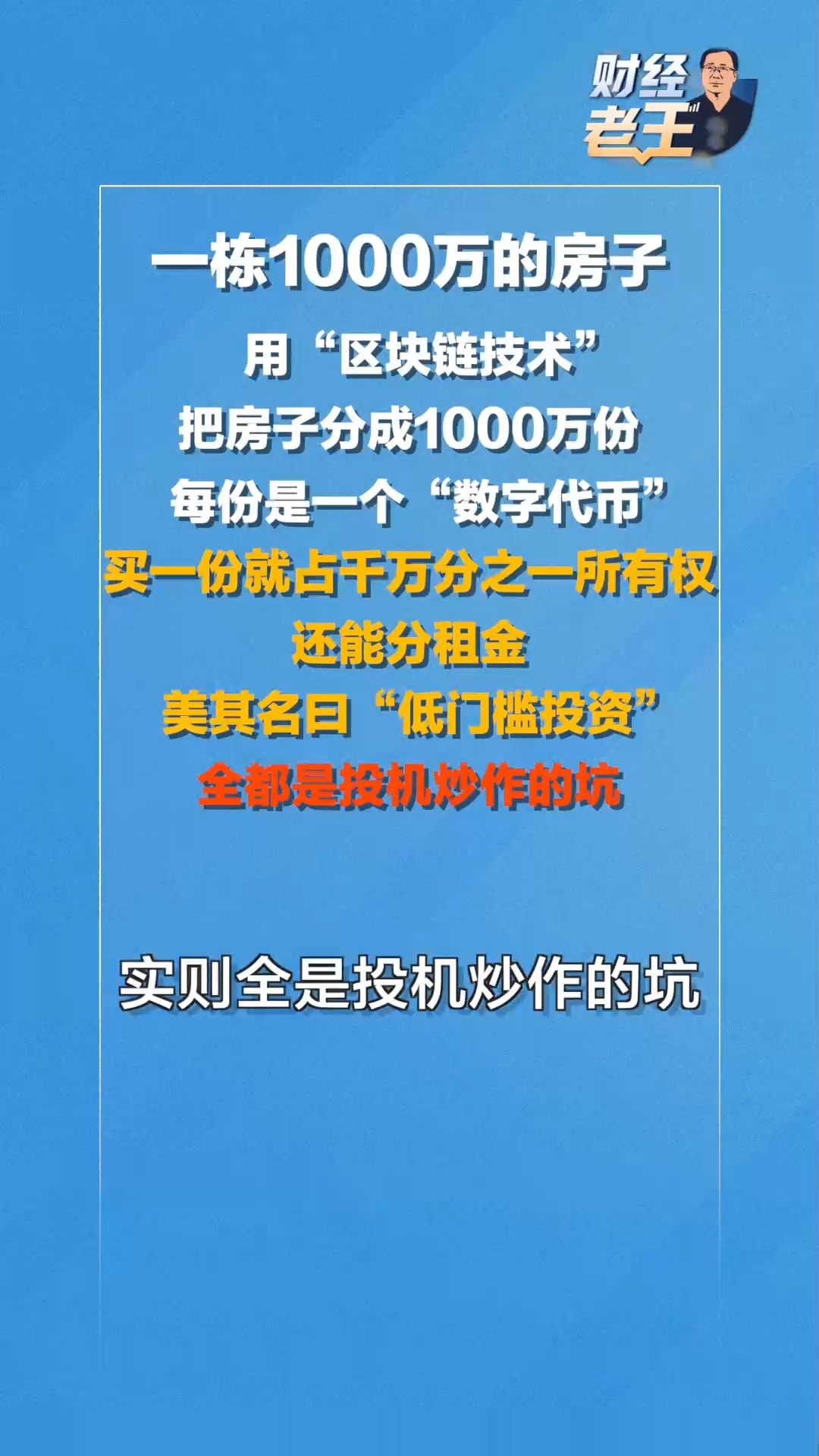 最近,RWA,也就是现实世界资产代币化成了热点,RWA到底是什么?老王打个比方,一栋1000万的房子,有人用所谓的“区块链技术”,把这栋房子分成1000万份,每份做成一个“数字代币”,谁买一份就占这房子千万分之一的所有权,还能分租金,美其名曰“低门槛投资”,实则全是投机炒作的坑。什么“光伏电站代币”“名画碎片投资”“碳资产Token”,只要向普通人募资,可能都是骗局,境内全面禁止。如果境内机构或个人想用内地公司的收益等资产,跑到境外搞“区块链数字凭证”融资,必须像上市或发债一样,需经过国家发展改革委、证监会、外汇局等部门的同意或备案,否则就涉嫌非法金融活动。