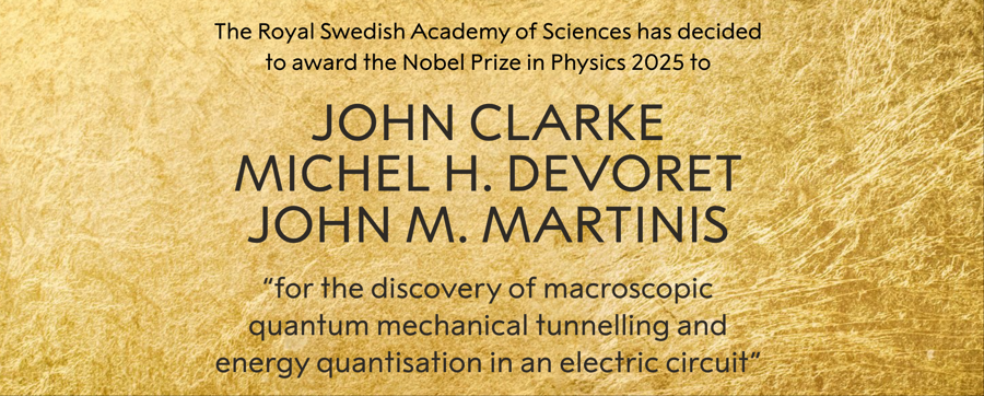 今年物理学奖授予约翰·克拉克、米歇尔·H·德沃雷、约翰·M·马丁尼斯,以表彰他们发现电路中的宏观量子力学隧穿效应和能量量子化
